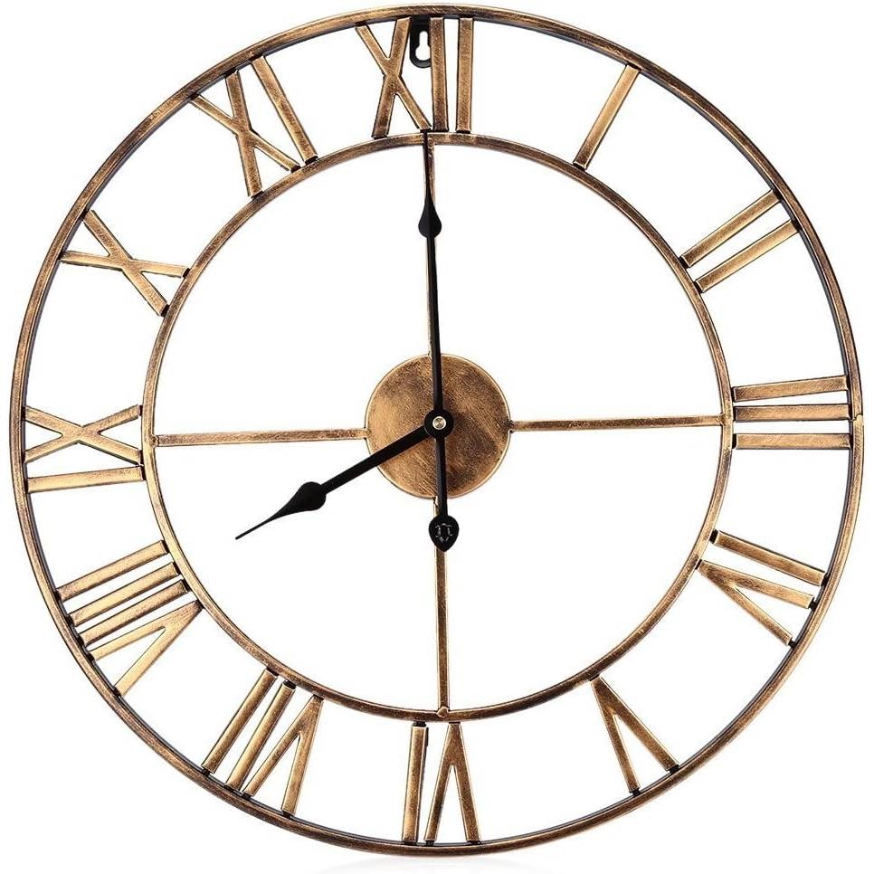 This Decorative 18.5-inch Roman Numerals Silent Non-Ticking Wall Clock in Gold is an oversized iron wall clock with European retro style and no frame surface. Enjoy a vintage display on the wall with a fashion pattern available, best decoration. Diameter: 18.5”(47cm) Classic and elegant and looks great on the wall of the living room, bedroom, kitchen, hallway, office, study, cafe, hotel, restaurant etc. Handmade iron metal, classic industrial Roman Numerals, with hand painted vintage color. Famous Qualify Quartz Sweep Movement and no second design guarantees accurate time & absolutely silent environment. Recommended AA ordinary Carbon Zinc or Heavy Duty battery (NOT Included), excluding Alkaline battery.